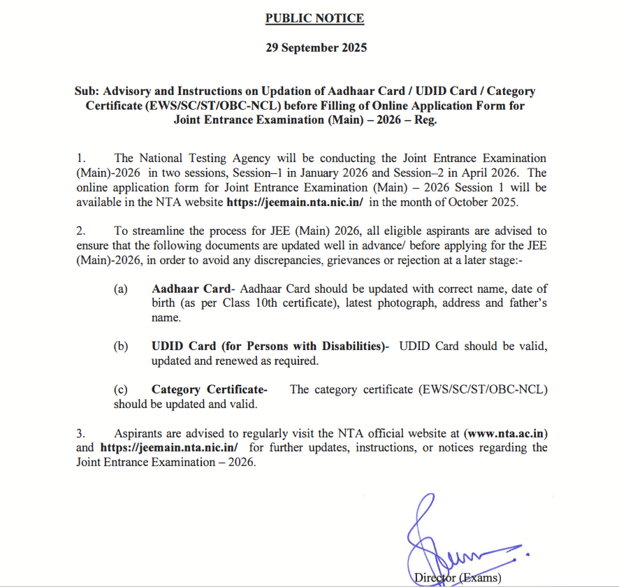 NTA जेईई मेन एग्जाम 2026 सत्र 1 के लिए 21 से 30 जनवरी, 2026 तक आयोजित किया जायेगा। वहीं जेईई मेन सत्र 2 1 से 10 अप्रैल, 2026 तक आयोजित किया जायेगा।
